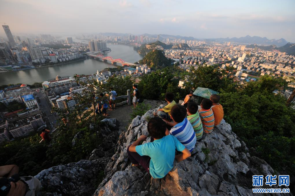 熊三耶(右一)和伙伴们在柳州市马鞍山眺望城市(2013年8月26日摄)。
