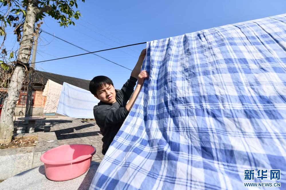 在柳州市鹧鸪江路附近的出租屋外,熊三耶在晒被子(2024年2月11日摄)。