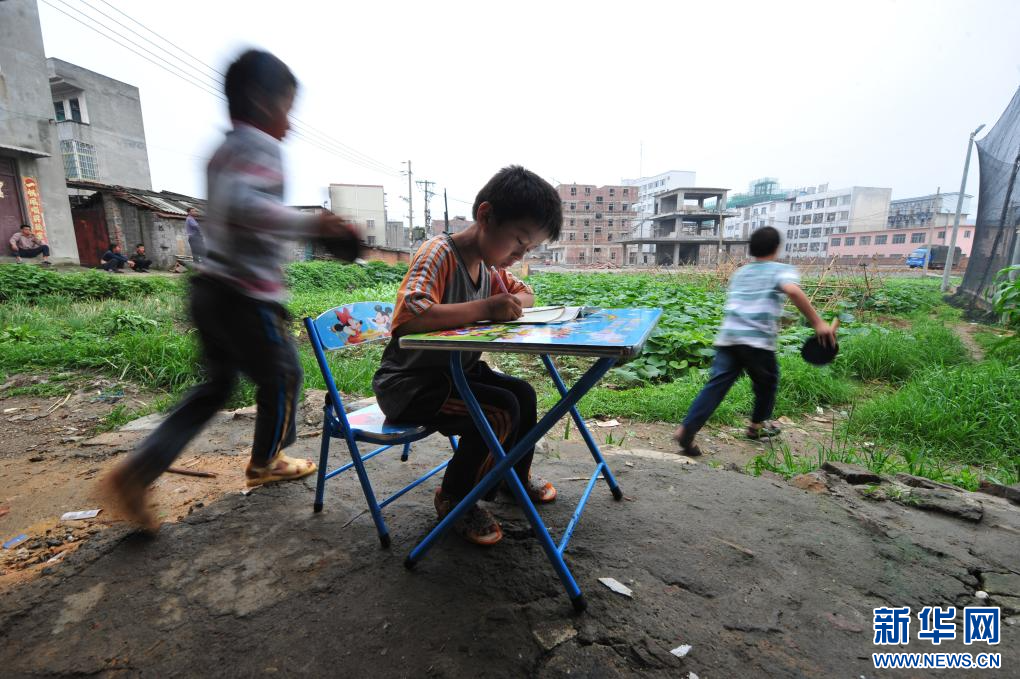 在柳州市白沙村,熊三耶在爱心小书桌上写作业(2012年5月24日摄)。