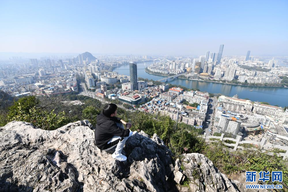 熊三耶在柳州市马鞍山上眺望城市(2024年2月11日摄)。