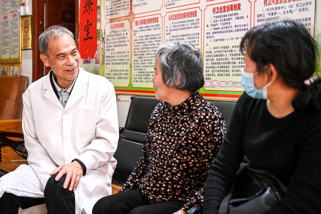 2月20日,在广西兴业县石南镇环江村卫生室,梁柱明(左一)与前来就诊的村民交流。