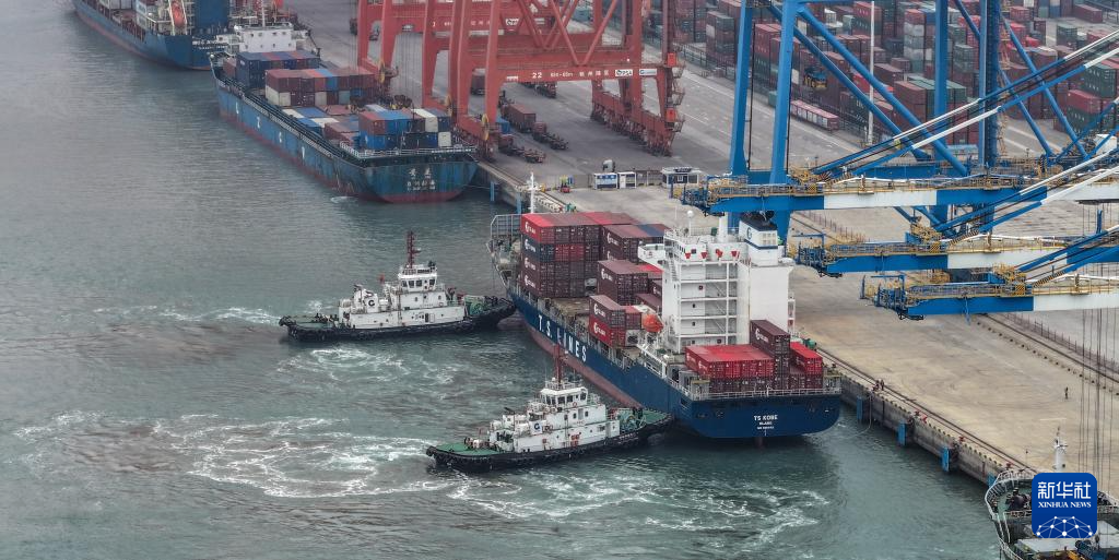 在广西钦州港码头,海事船在助推海轮靠岸卸货(3月1日摄,无人机照片)。
