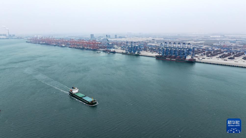 一艘满载货物的海轮驶离广西钦州港码头(3月1日摄,无人机照片)。