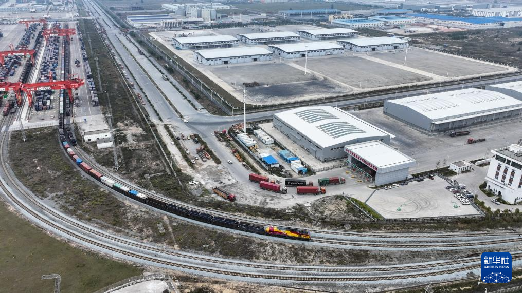 一列载着集装箱的火车驶离广西钦州铁路集装箱中心站(3月1日摄,无人机照片)。