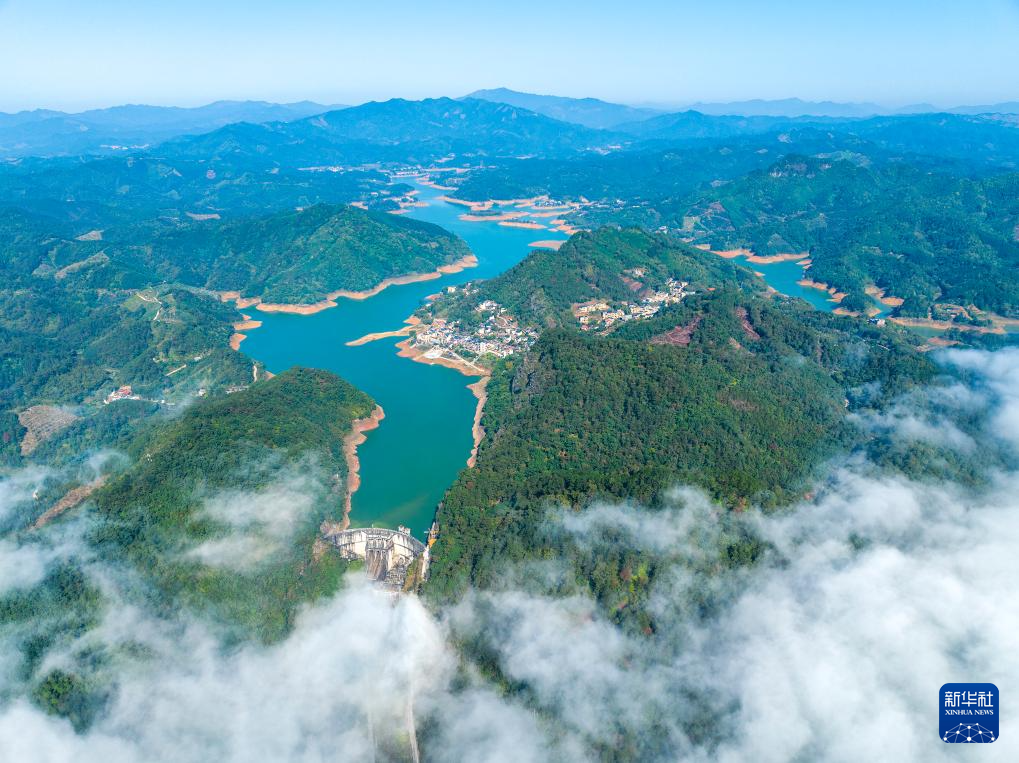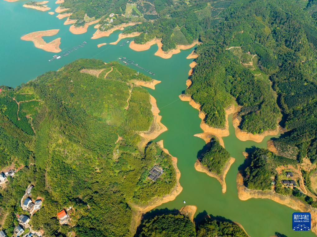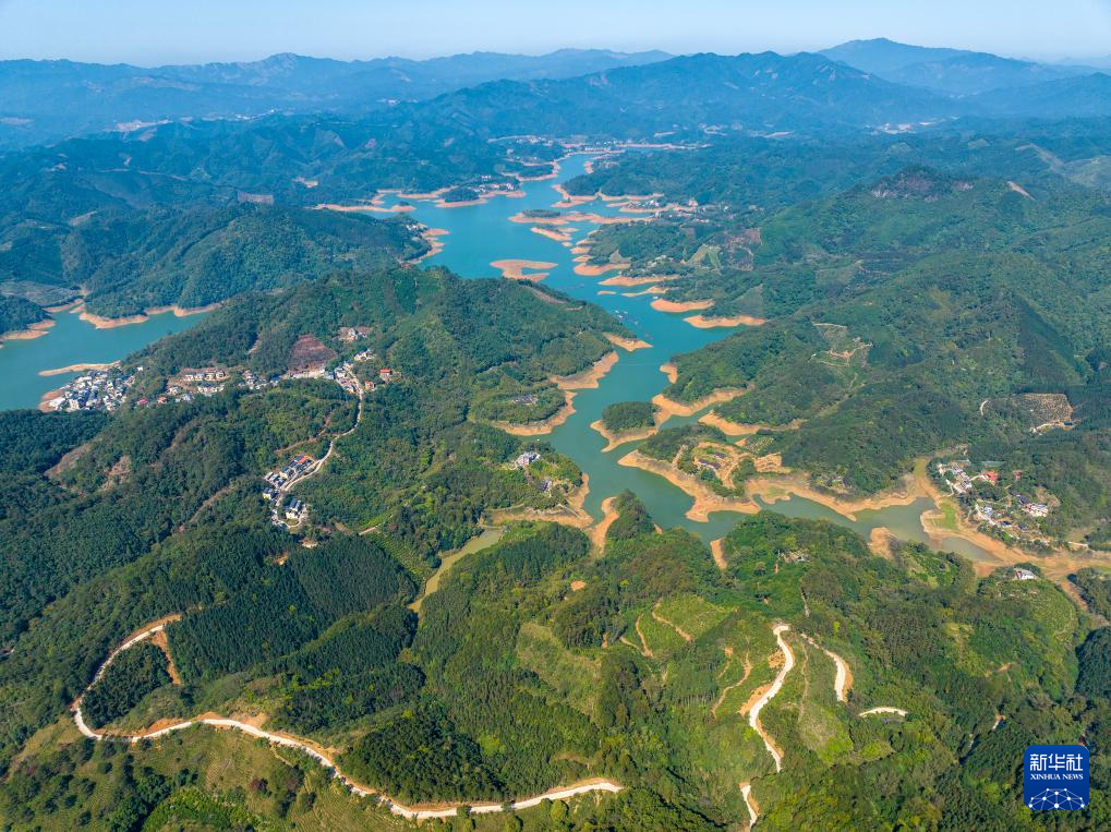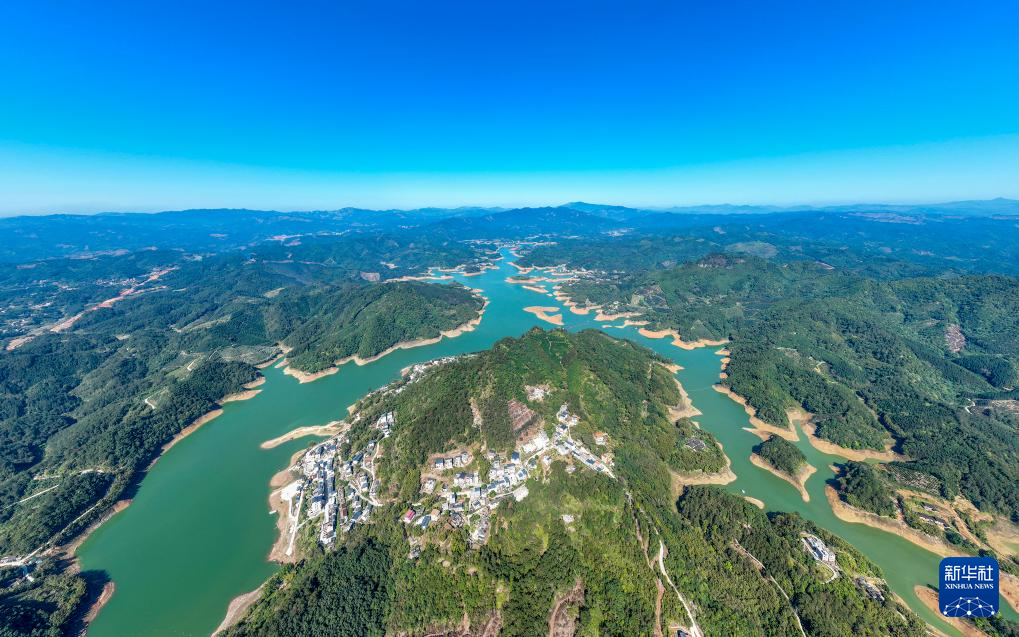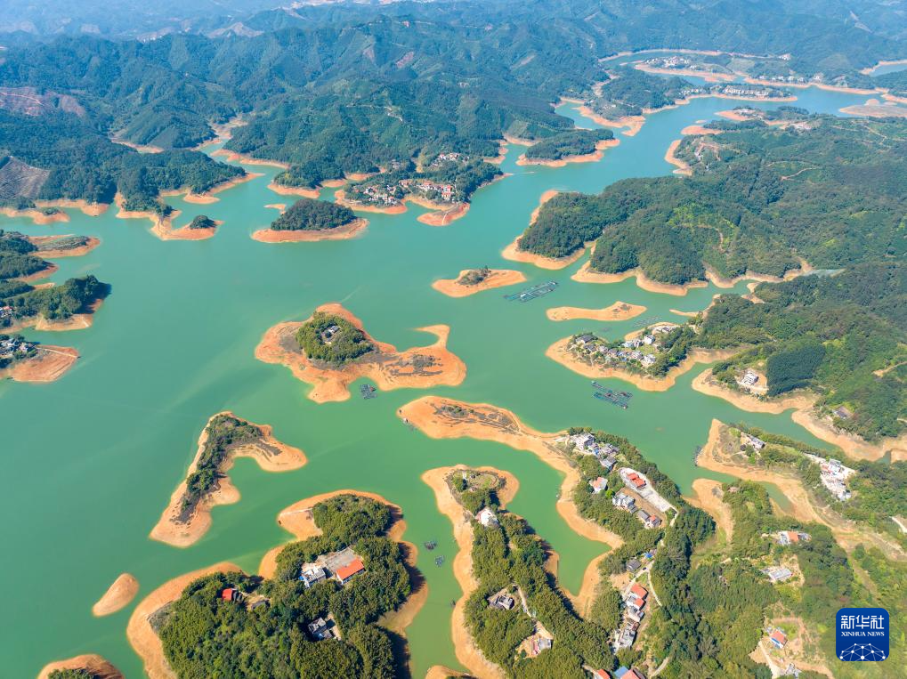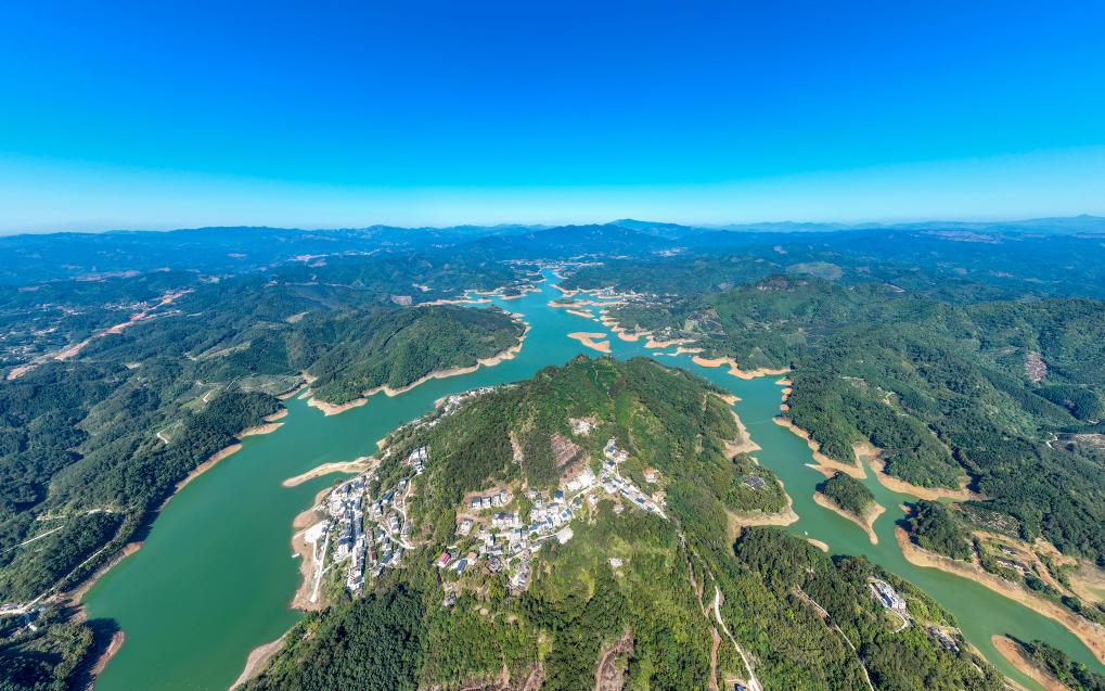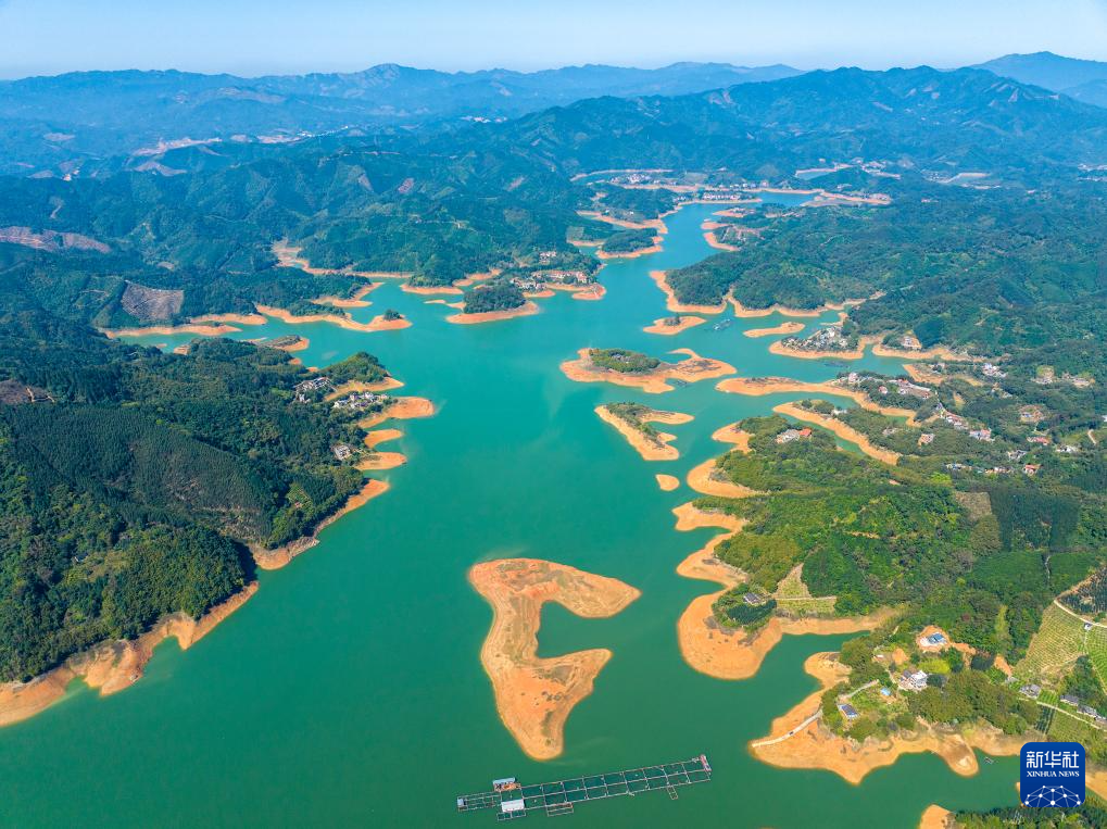 2024年3月12日,广西梧州市苍梧县梨埠镇爽岛水库湖面上小岛星罗棋布,港湾纵横交错,蓝天与湖水交相辉映,构成一幅绿水青山美丽画卷。