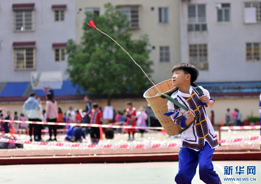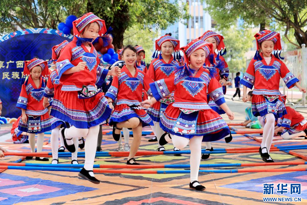 4月9日,在广西柳州市融安县实验小学,学生在跳竹竿舞。