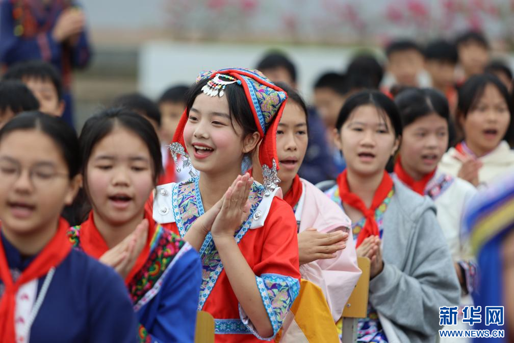 4月8日,在广西钦州市钦北区贵台镇中心小学,学生们在操场唱山歌。