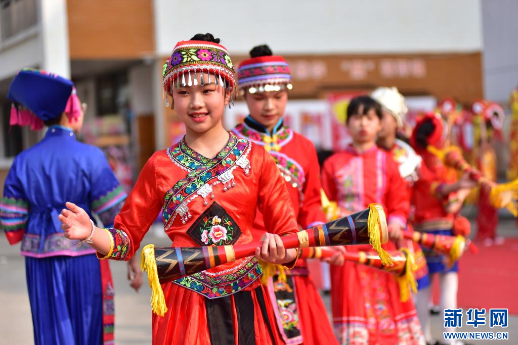 4月9日,在广西贺州市太白路小学,学生在表演瑶族长鼓舞。