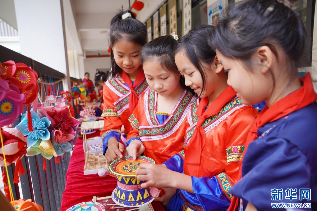 4月8日,在广西防城港市上思县思阳镇第二小学,学生在迎“三月三”活动上欣赏手工作品。