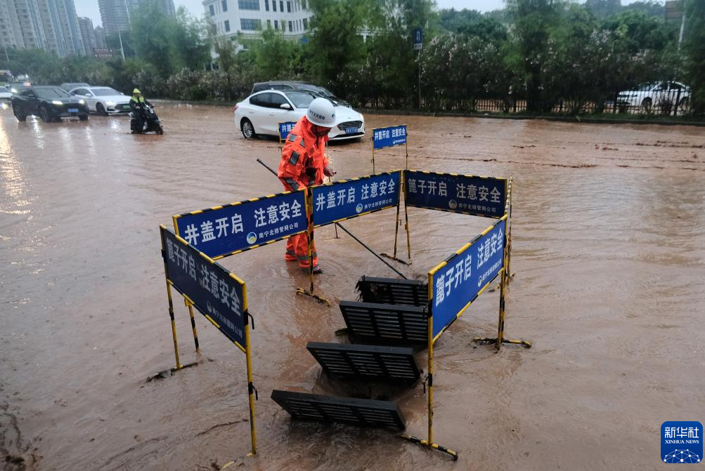5月19日,在南宁青环路上,工作人员将下水道篦子打开加快积水下泄速度。