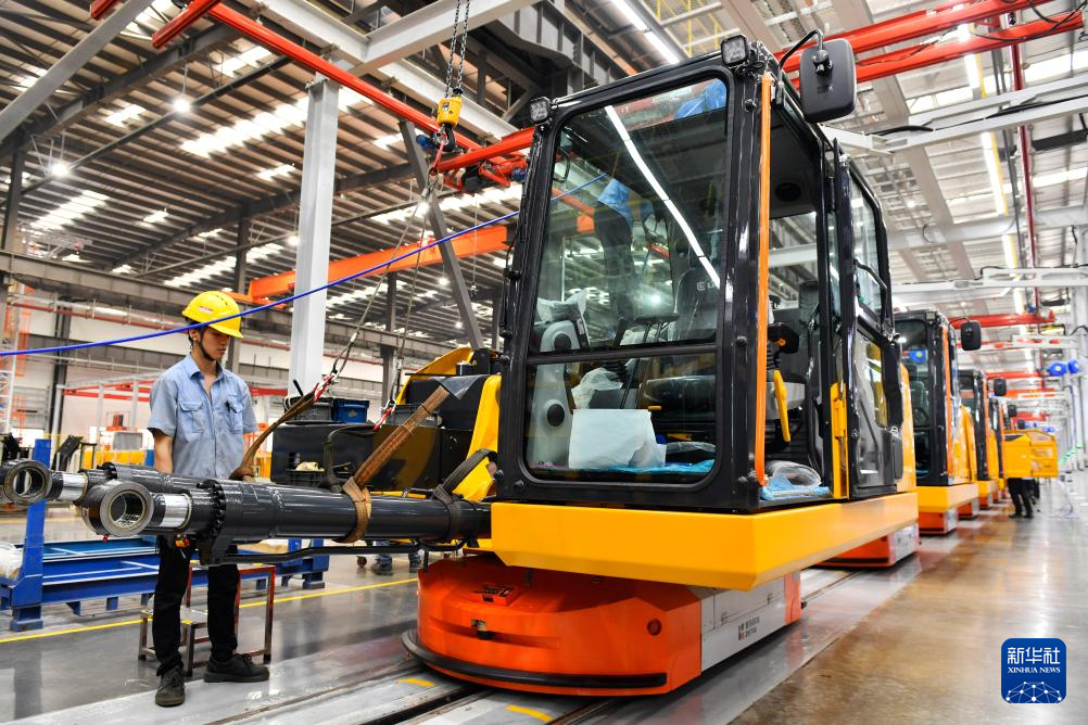 在广西柳州市柳工挖掘机智慧工厂,工作人员进行挖掘机行走驱动液压管路连接(5月10日摄)。