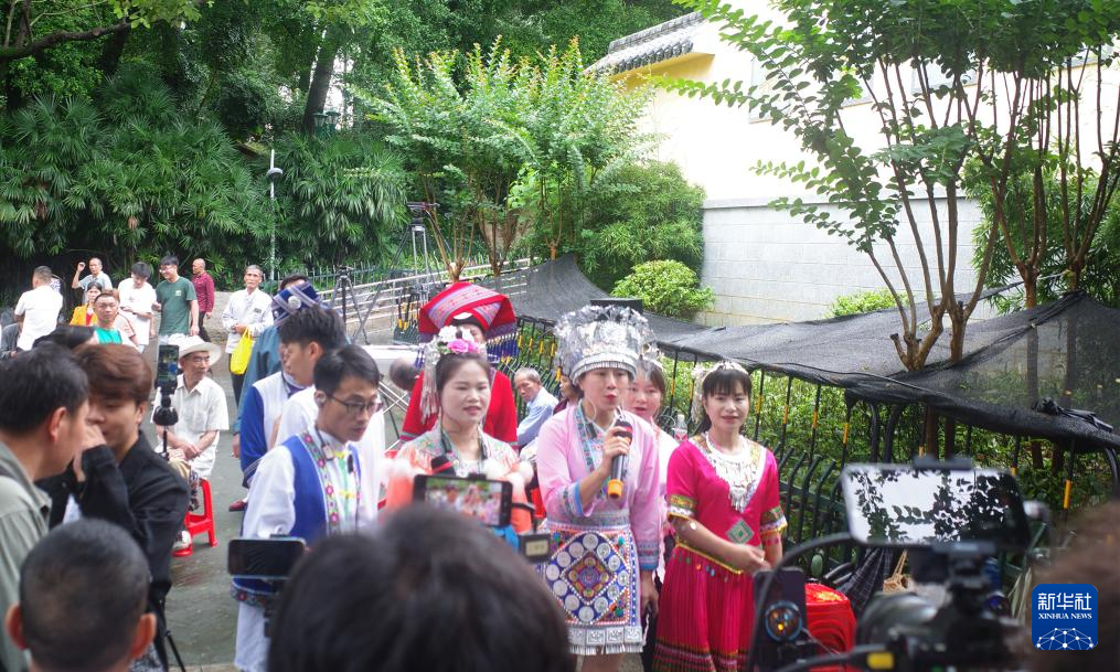 广西柳州鱼峰公园内,民间歌手正在直播唱山歌。新华社记者 李欢 摄