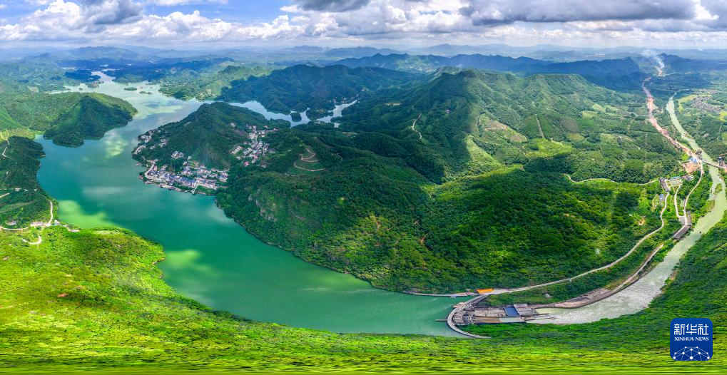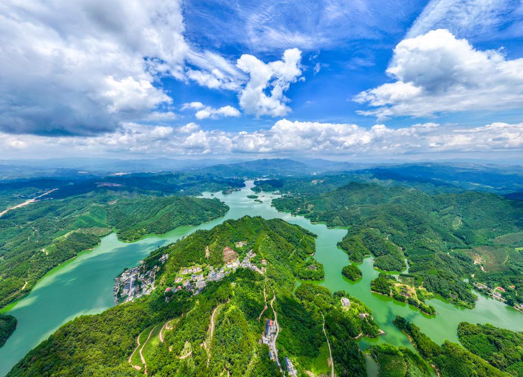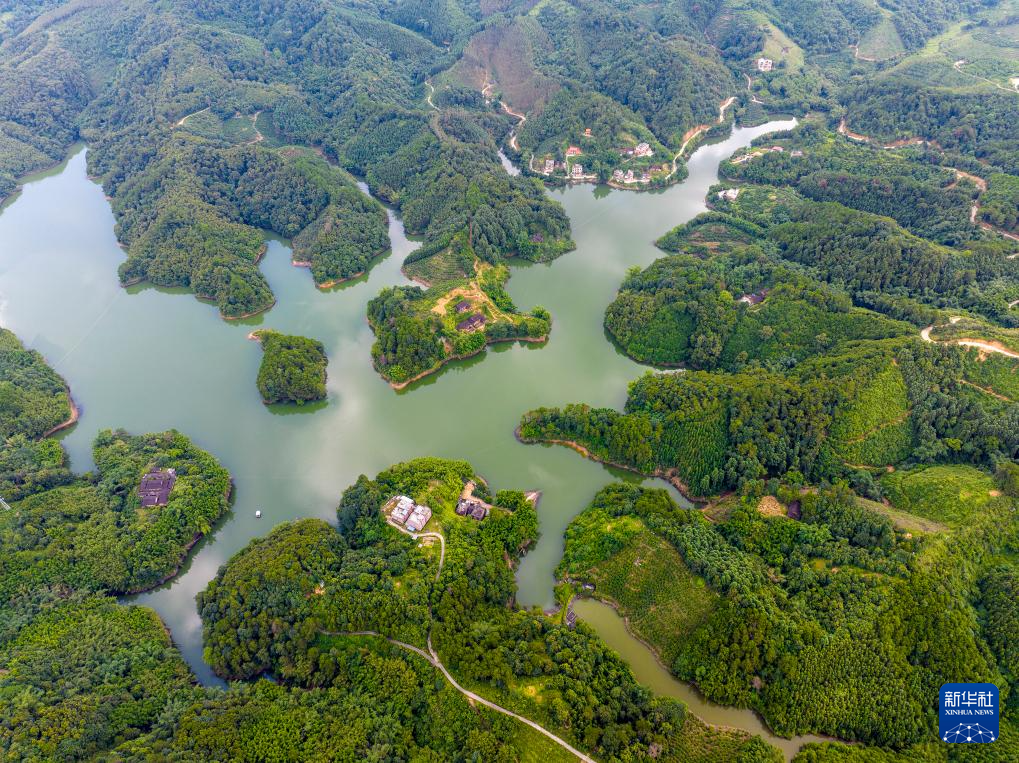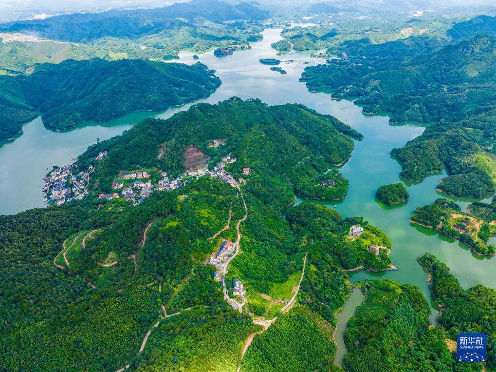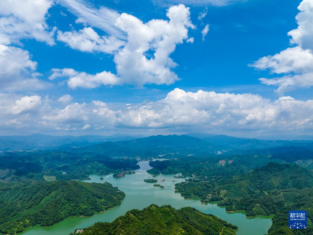 以上图片:2024年7月9日,俯瞰广西梧州市苍梧县梨埠镇爽岛水库,湖面上小岛星罗棋布、港湾纵横交错,蓝天与湖水交相辉映,构成一幅绿水青山的美丽画卷。(无人机照片)CICPHOTO/何华文 摄