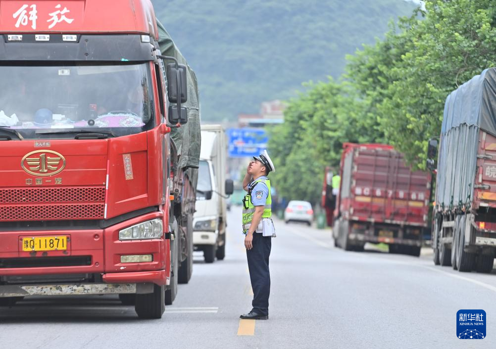 7月23日,在广西柳州市柳江区里高镇,警务人员在检查货车司机是否存在疲劳驾驶行为。