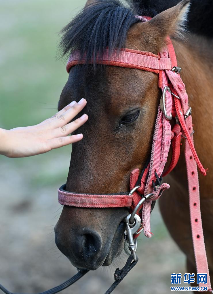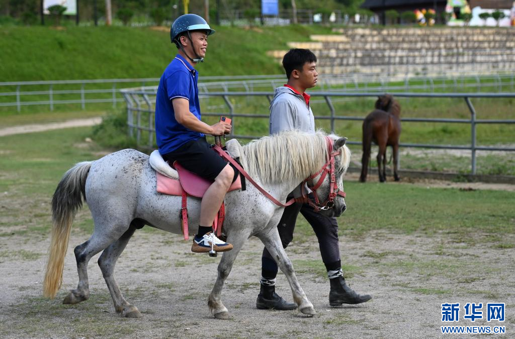 8月27日,游客在广西德保矮马王国骑德保矮马游玩。