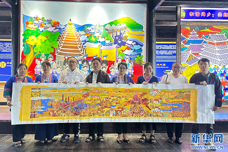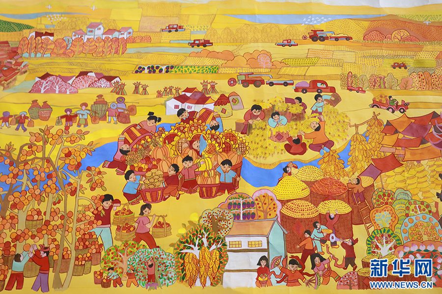 在丰收节到来之际,柳州市三江侗族自治县农民画家们联手创作《中国农民丰收节》长卷,包括“丰稔江河”“稻香四溢”“和美侗乡”“普天同庆”“大地铺金”五个章节,描绘华夏儿女庆丰收之景。(李心)
