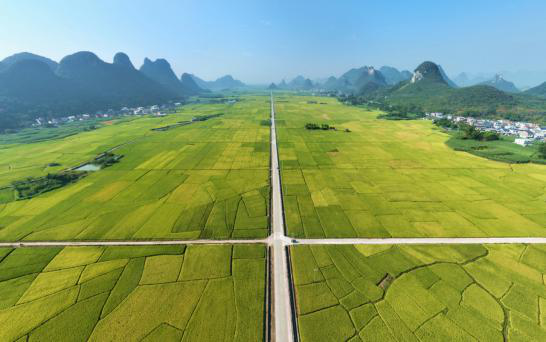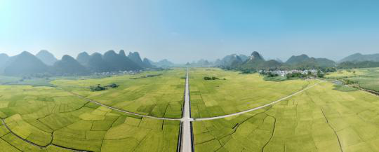 10月12日,在广西柳州市柳城县古砦仫佬族乡,成片的稻谷即将迎来丰收,稻田与村庄、道路、山峦构成一幅秀丽的田园画卷。