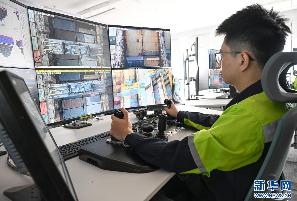 在广西北部湾港钦州港区远程控制中心,工作人员使用远控设备进行码头集装箱吊装作业(10月20日摄)。