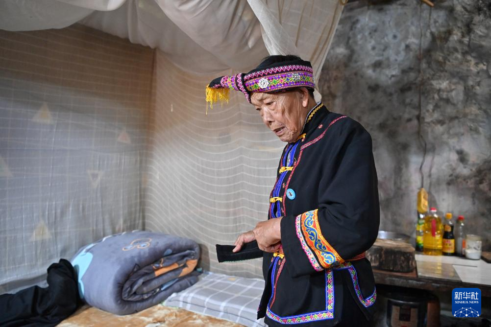阮桂陆在田东县作登瑶族乡梅林村的家中换上民族服装,准备表演(10月28日摄)。