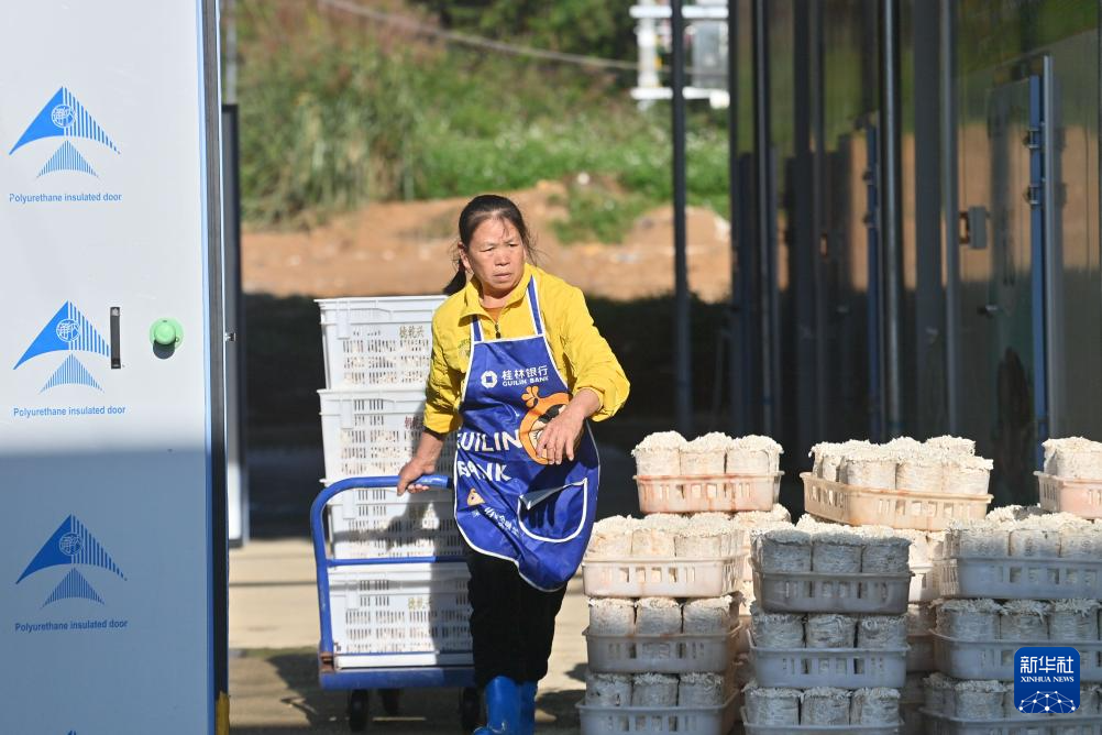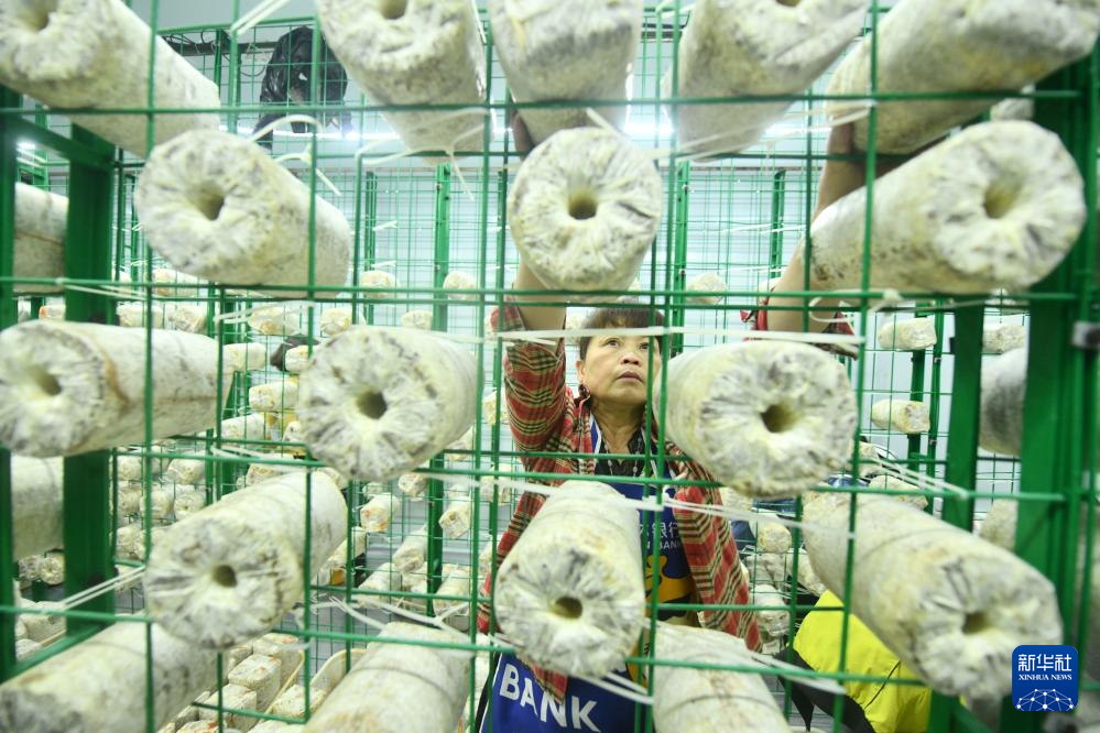 在广西百色市德保县城关镇那造村食用菌生产基地,村民在智能小方舱内将菌棒上架(10月29日摄)。