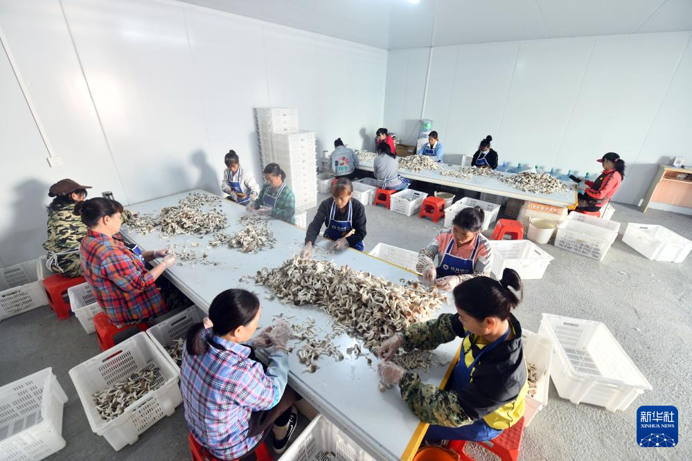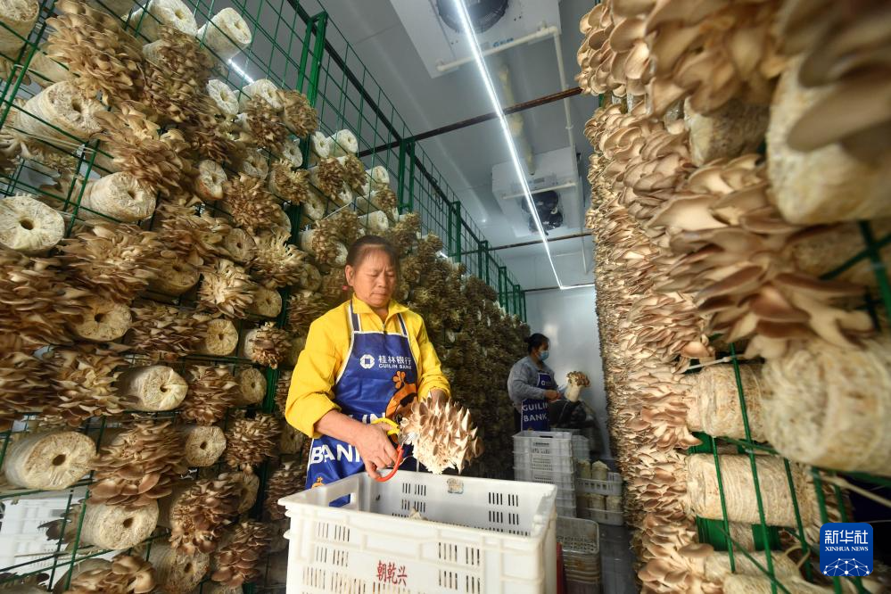 在广西百色市德保县城关镇那造村食用菌生产基地,村民在分拣蘑菇(10月31日摄)。