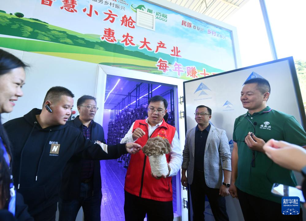 在广西百色市德保县城关镇那造村食用菌生产基地,驻村第一书记蒋士圳(右三)向来访者介绍食用菌产业情况(10月29日摄)。
