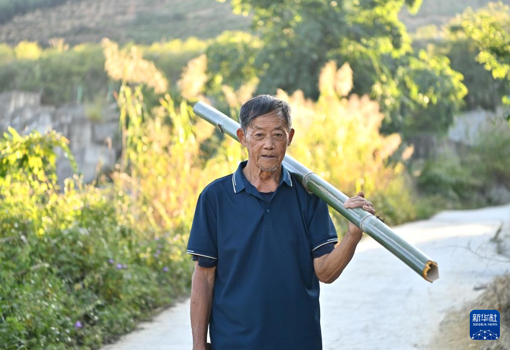 冯光明在广西百色市西林县普合苗族乡大河村扛着刚砍的竹子回家(10月29日摄)。