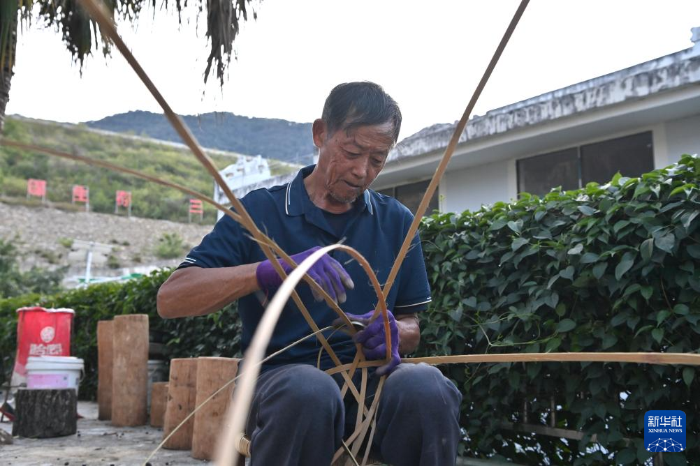 冯光明在广西百色市西林县普合苗族乡大河村编竹笼(10月29日摄)。