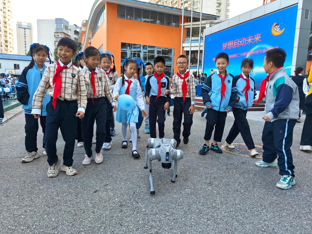 学生在学校2024年科技运动会上与机器狗互动。