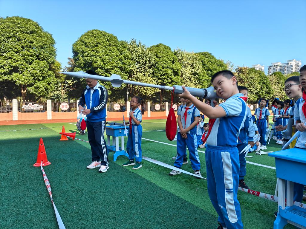 学生在学校2024年科技运动会上体验气火箭项目。