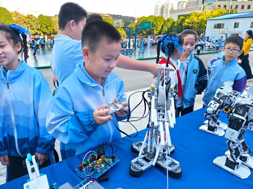 学生在学校2024年科技运动会上体验机器人编程项目。