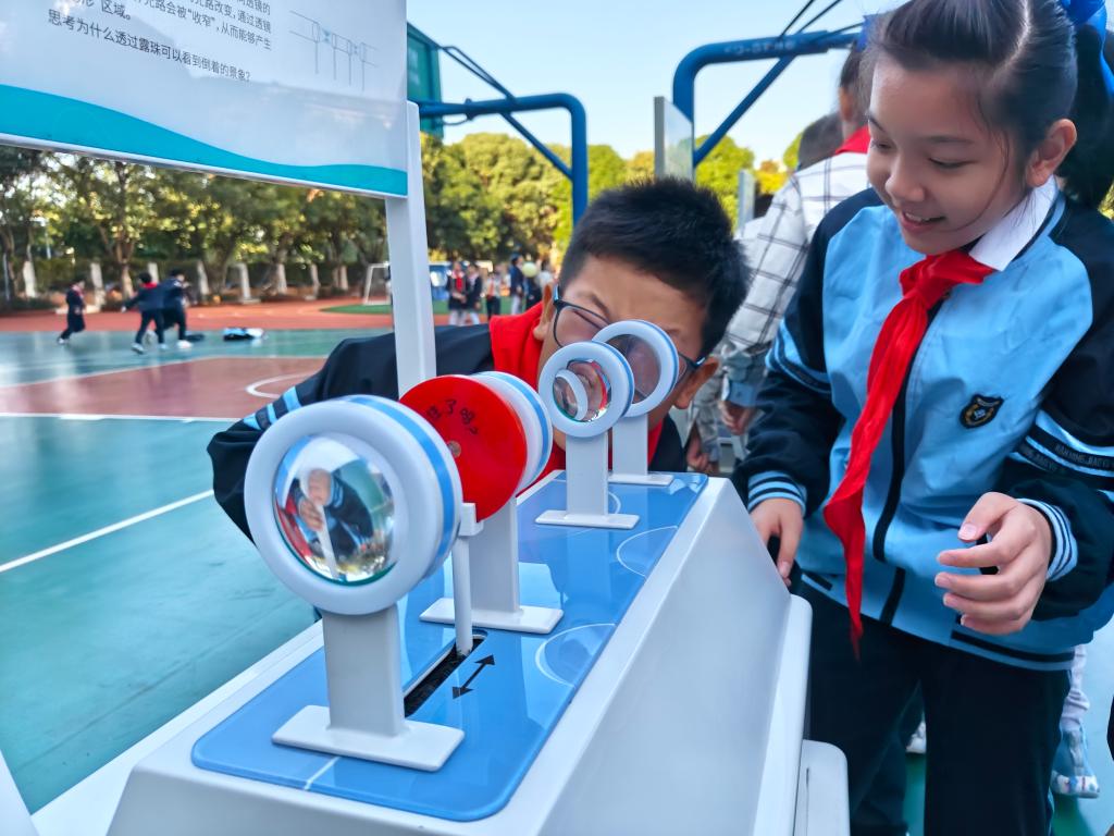 学生在学校2024年科技运动会上体验透镜原理。