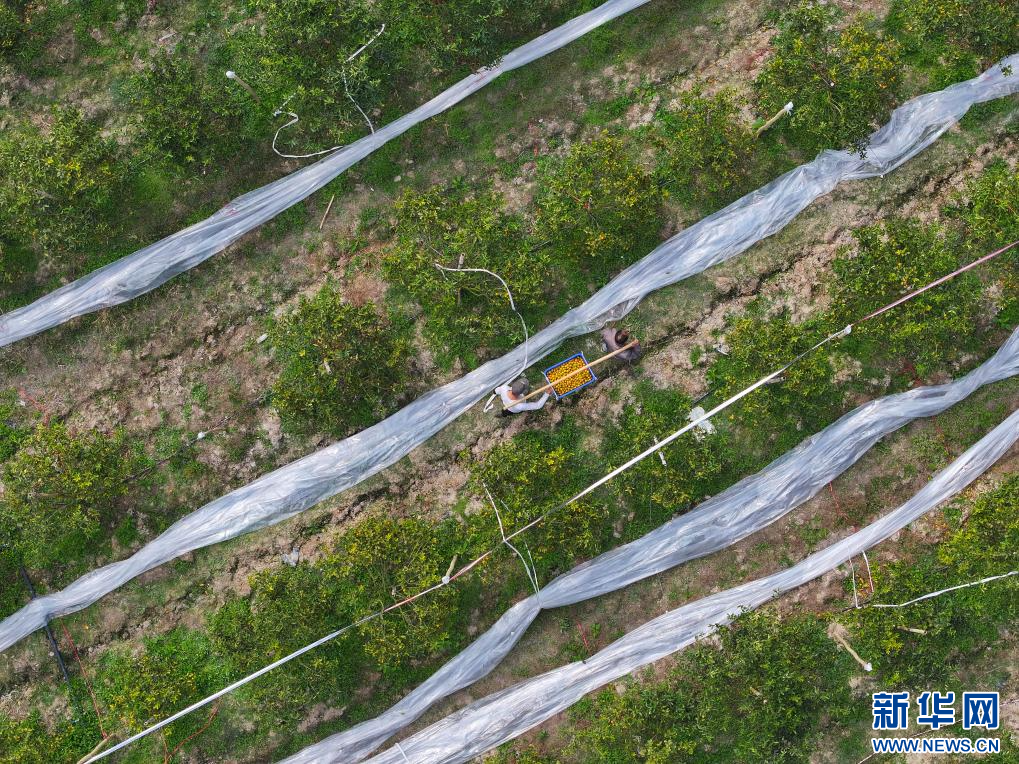 12月18日,在柳州市柳江区土博镇水源村,村民在搬运金桔(无人机照片)。