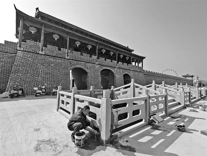 1月6日上午,记者在位于会仙河公园东侧的铜州古城项目现场看到,古朴风格的城墙绵延数百米,中间是巍峨屹立的城楼,城楼上挂着大红灯笼,喜庆气氛浓厚。城门前的石拱桥已铺设完毕,工人在进行最后的修缮收尾工作。城墙、石拱桥和灯笼相互映衬,使古香古色的城楼充满浓浓的历史韵味。现场施工人员介绍,铜州古城城楼共3层,两层屋檐,高10多米、宽25米,设3个城门,城门高4米多、宽5米。城门前的石孔桥宽4米多、长22米。