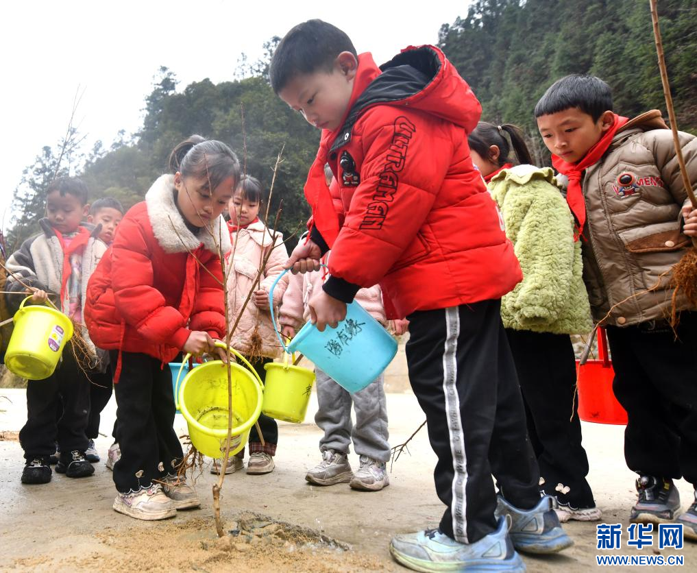2月26日,在融水苗族自治县杆洞乡党鸠村,参加植树活动的小学生给树苗浇水。