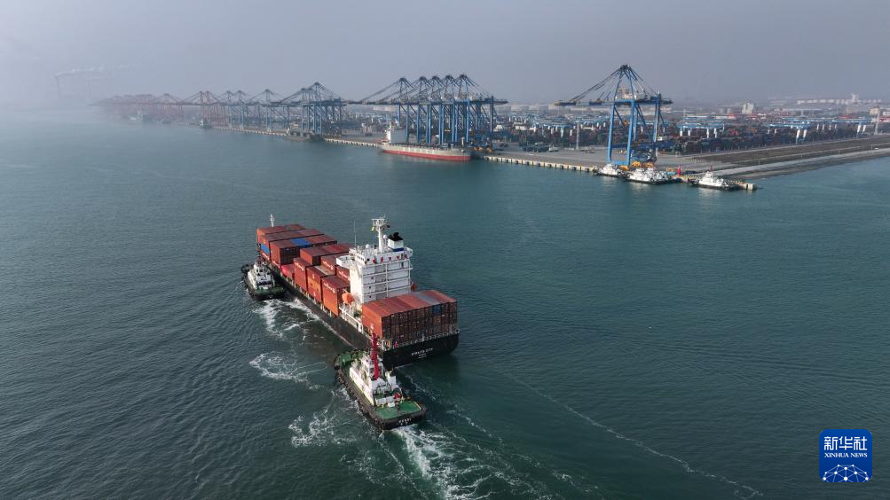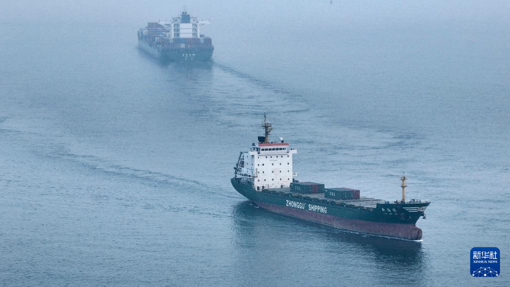 3月4日,一艘海轮准备停靠钦州港下卸集装箱(无人机照片)。
