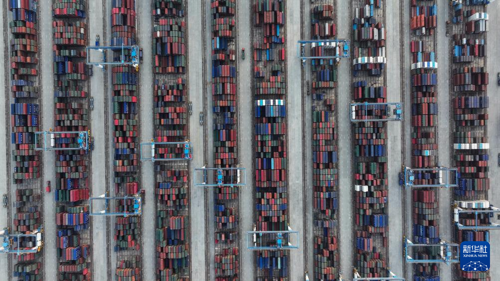 3月4日拍摄的钦州港集装箱自动化码头的集装箱储放地(无人机照片)。