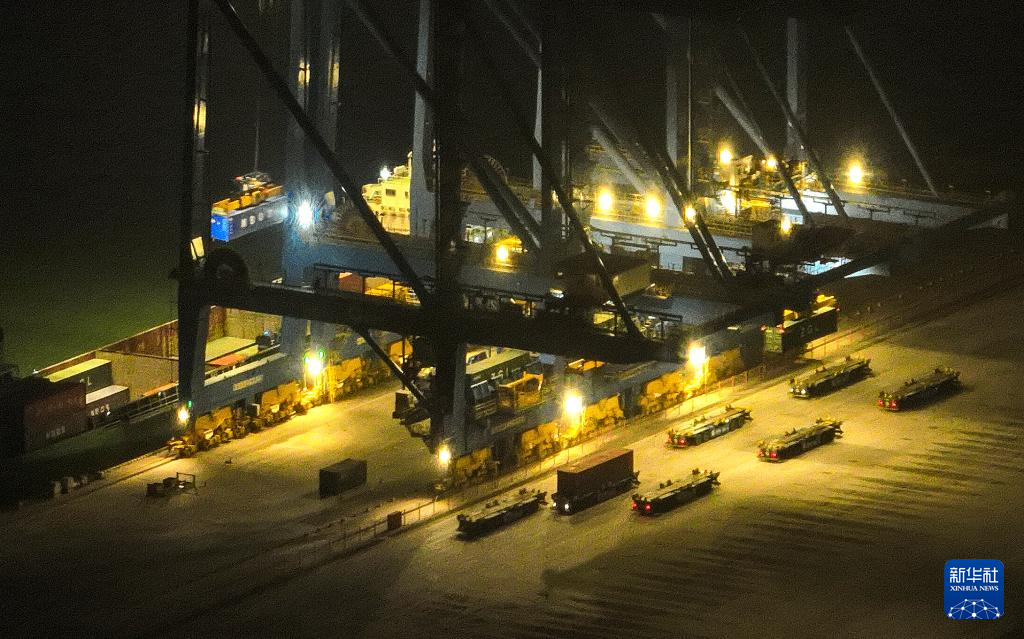 3月4日拍摄的进行夜间作业的钦州港集装箱自动化码头(无人机照片)。