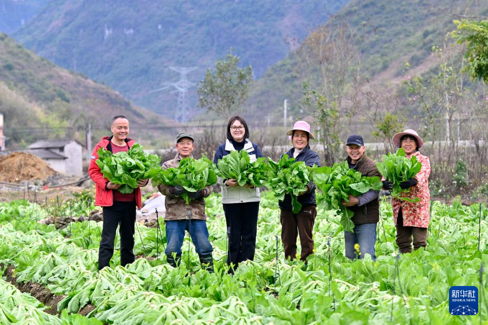 在广西柳州市柳江区三都镇白见村板朝屯,颜茜茜(左三)、父亲颜建条(左一)和村民们在展示刚刚采摘的芥菜(2025年3月6日摄)。30岁的颜茜茜是当地一名返乡创业青年。2021年,大学毕业后在机场工作了五年的颜茜茜,辞职回到家乡创业,和父亲颜建条成立了农业公司,采用“公司+种植基地+合作社+农户+加工厂”的经营模式,发展竹笋和蔬菜的种植、研发、腌制产业,探索传统腌菜产业规模化、高品质生产新模式。