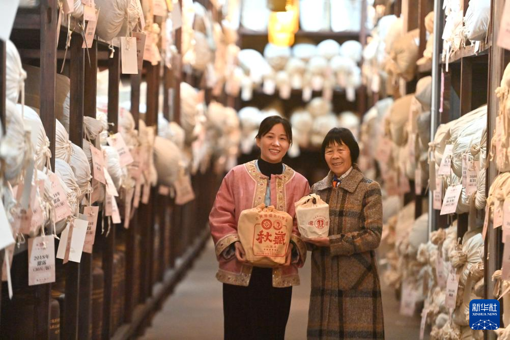 在广西梧州市苍梧县六堡镇黑石山茶厂,六堡茶制作技艺国家级代表性传承人韦洁群(右)和女儿石濡菲在展示六堡茶(2025年2月21日摄)。多年来,母女俩依托六堡茶原产地和六堡茶历史文化等优势,创新产业融合发展模式,带动一方群众增收致富。