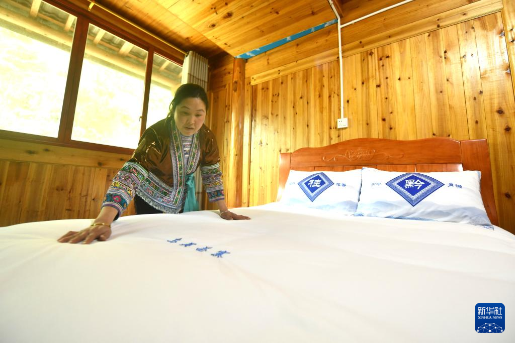 在广西柳州市融水苗族自治县杆洞乡党鸠村乌英苗寨,40岁的何玉青在展示民宿的床上用品(2025年2月26日摄)。18年前,何玉青和丈夫返乡创业,他们买车拉客运货、经营小商店、种田养鱼、办民宿卖特产,逐渐成为苗寨的致富带头人。