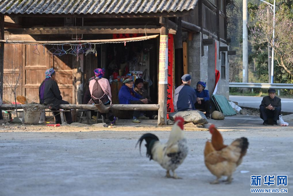 在广西融水苗族自治县安太乡江竹村,劳作归来的村民们在村口聊天(3月20日摄)。
