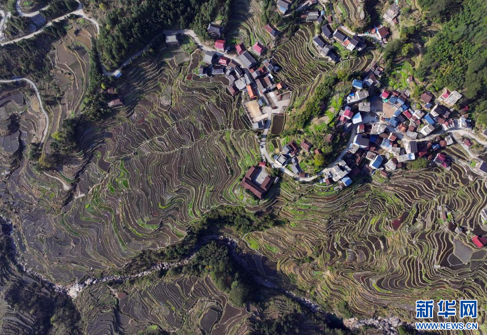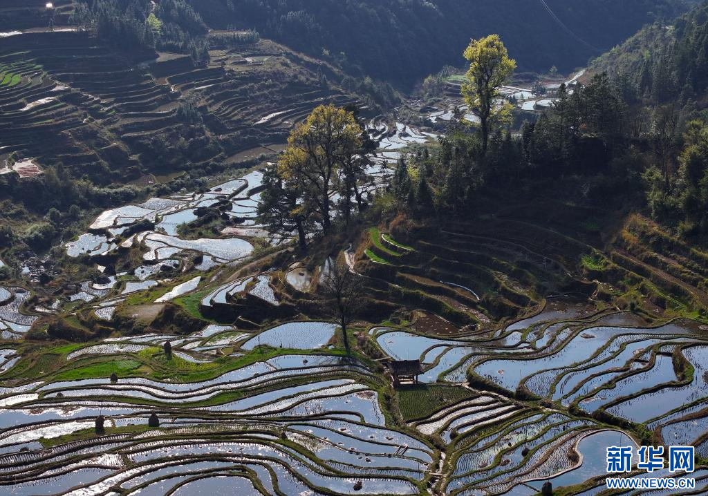 这是广西融水苗族自治县安太乡小桑村的田园春景(3月21日摄,无人机照片)。