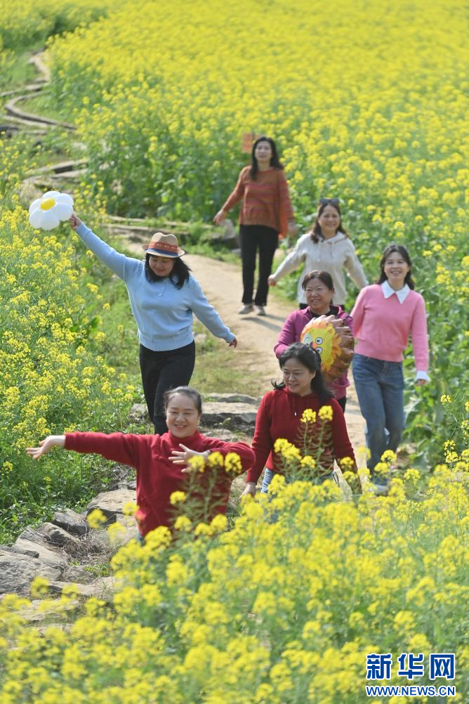 游客在广西融水苗族自治县融水镇新国村的油菜花地踏青游玩(3月21日摄)。
