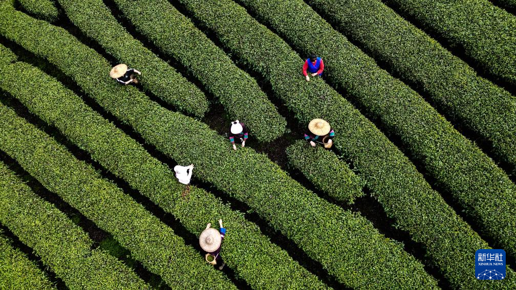 三江侗族自治县同乐苗族乡寨大村的茶农在山上采茶(3月21日摄,无人机照片)。
