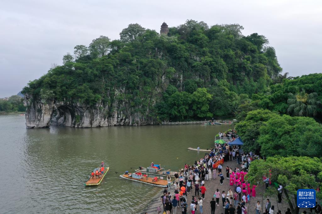 游客在桂林市象山景区游玩(2024年4月18日摄,无人机照片)。