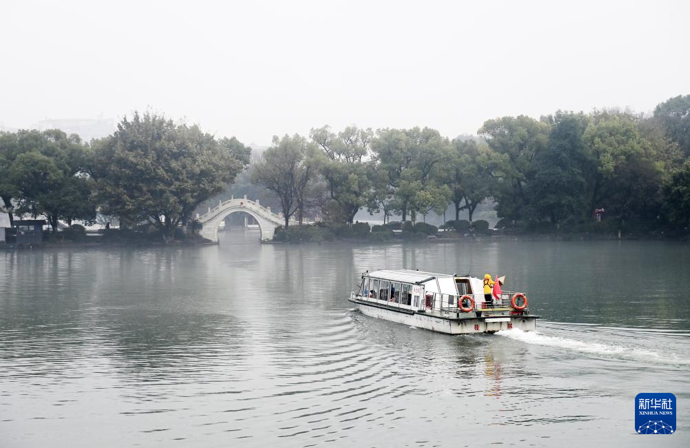 游客乘坐游船在桂林市杉湖上观光(2025年3月12日摄)。
