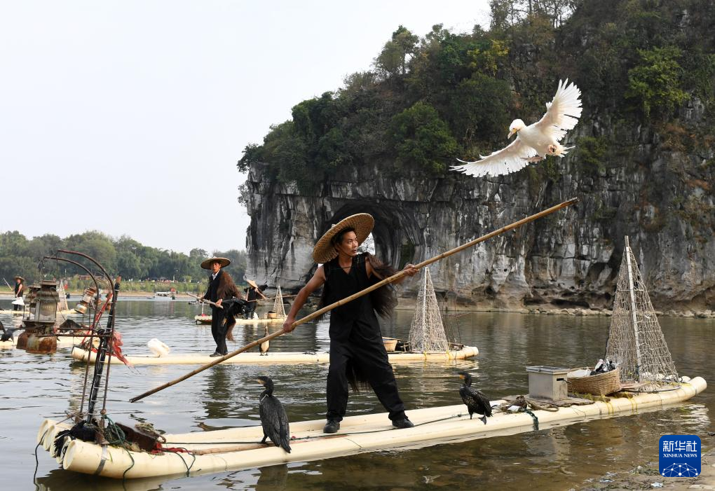 这是桂林市象山景区鱼鹰捕鱼表演场景(2017年10月24日摄)。