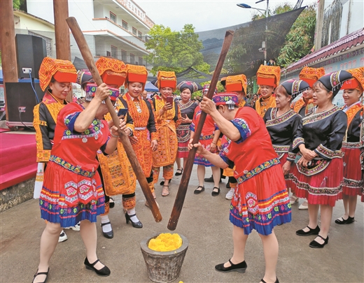 宁明县爱店镇堪爱村各族群众一起舂糍粑。 陈桂梅、黄建崇/摄