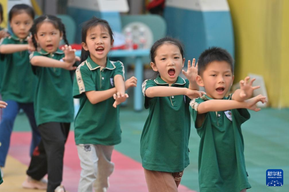 5月13日,小朋友在蒙山县蒙山镇大风车幼儿园练习拳术。